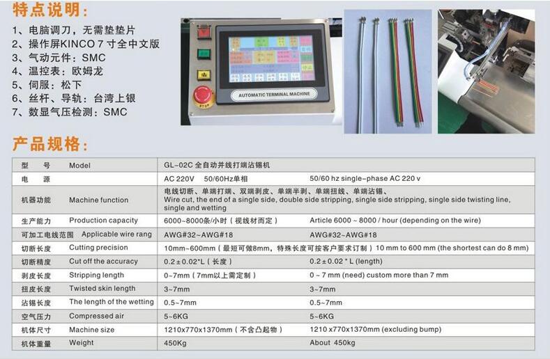 7. 全電腦數(shù)控調(diào)試:刀口大小,剝皮長度,打端深度,沾錫深度